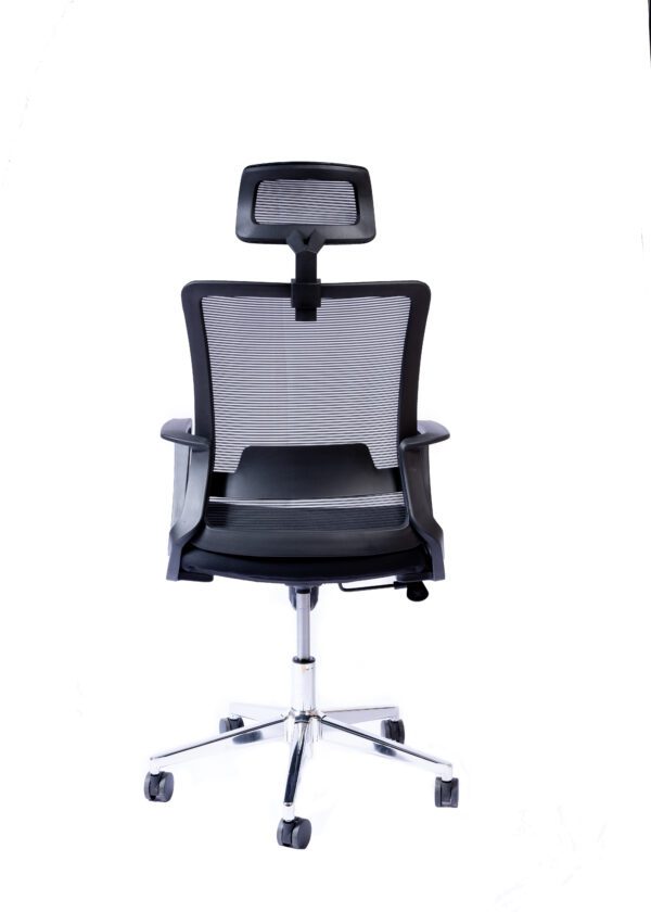This is a posture friendly ergonomic High-Back office chair with a beautiful black mesh back, colored fabric seat and black frame and a chrome base. The seat has wheels, is adjustable in height and the back tilts for comfort and back support.